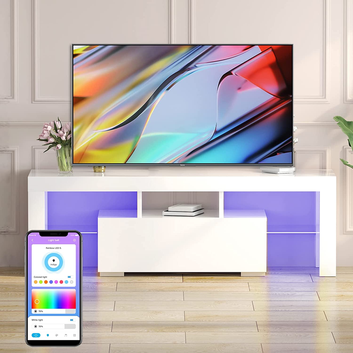 Mjkone White Tv Stand For 55 Inch Tv High Gloss Television Stands With Smart Rgb Led Strip Light 1600 Million Colors Led Light Controlled By Alexa Or App Modern Tv For Living